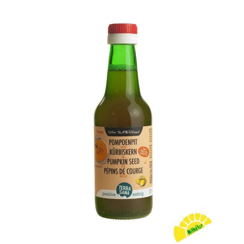 aceite de semilla de calabaza es prensado en frío de semillas de calabaza onvliesde y sin tostar. El aceite tiene un delicado sabor a nuez. Uso de calabaza preferentemente en frío por lo que el sabor puro y nutrientes son retenidos.La calabaza es delicioso como aderezo en su ensalada el risotto muesli o como un toque final a la sopa.