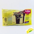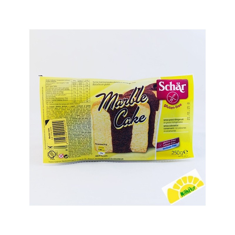 Descripción. Exquisito bizcocho marmolado sin gluten y sin lactosa. La última novedad de Schar para los más golosos. Ingredientes. Huevo azúcar aceite de girasol harina de arroz almidón de maríz humectante. sorbitol harina de maíz almdión de arroz cacao en polvo de 14% emulgente. mono-y diglicéridos de ácidos grasos gasificantes. difosfato disódico carbonato ácido de socio espesantes.goma xantana harina de algarroba sal aroma natural acidultane. ácido tartárico. Tabla Nutricional. Por cada 100g. Valor energético. 436kcal Grasas 23g -de las cuales son saturadas 36g Hidratos de carbono 51g -de los cuales son azúcares 21g Proteínas 46g Fibra alimentaria 32g Sal 088g