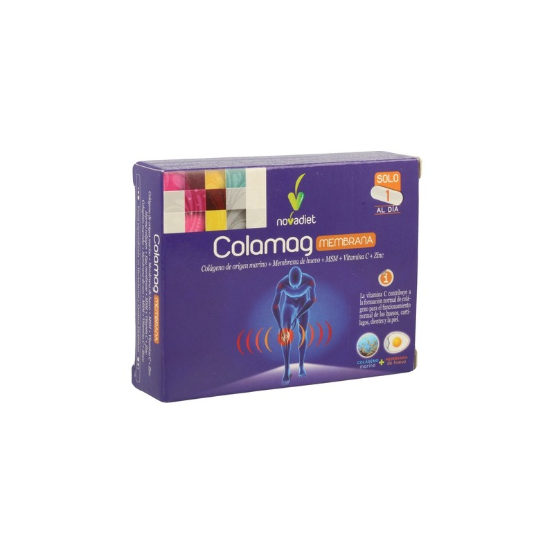 Colamag Membrana de Novadiet es un complemento alimenticio que contribuye al normal funcionamiento de las articulaciones. Es un complemento alimenticio ideal para las personas deportistas. Protege las articulaciones, regenera el cartílago articular, disminuye la rigidez. Protege el esqueleto óseo, los ligamentos y tendones y aumenta la elasticidad tendinosa. Hidrata la piel y ayuda a reparar heridas y agresiones en la piel.