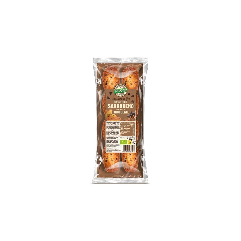 Huevos enteros*, harina de trigo sarraceno* (25%), azúcar moreno de caña de comercio justo*, pepitas de chocolate de comercio justo* (16%) (pasta de cacao*, azúcar moreno de caña*, manteca de cacao*), aceite de girasol oleico desodorizado*, azúcar invertida*, aroma natural de almendra*, aroma natural de vainilla* (alcohol*, vainilla*), polvos de hornear (bicarbonato de potasio, bicarbonato de sodio), sal marina, goma de xantano, antioxidante: extracto de romero*. *De agricultura biológica.