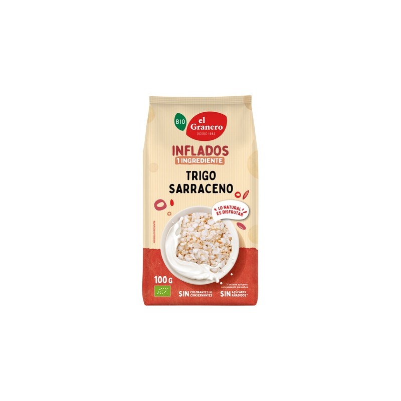 Trigo Sarraceno Hinchado Bio de El Granero Integral es la forma más ligera y crujiente de cereales para desayunos, meriendas o para dar un toque de textura a yogures y cremas.