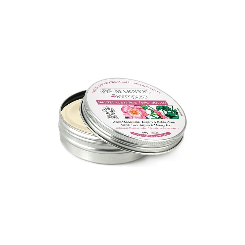 La Manteca de karité Rosa Mosqueta, Argán y Caléndula Biológico Marnys Dermpure es especial para regenerar, calmar e hidratar la piel.
