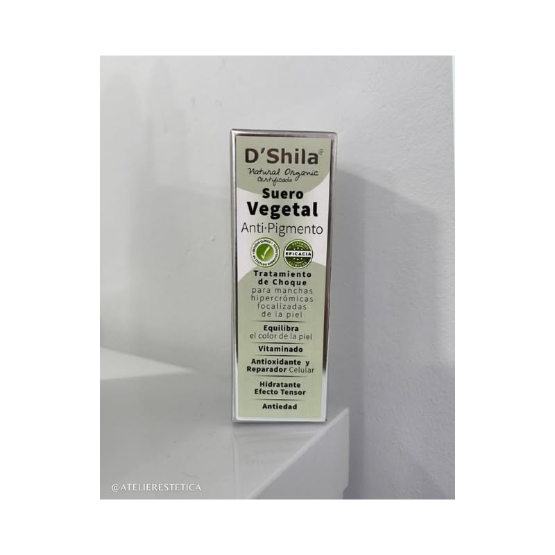 El Suero Vegetal Anti-Pigmento D'Shila® está indicado para zonas focalizadas del cutis y la piel que presenten manchas hipercromáticas con exceso de pigmentación. Este tratamiento reduce de forma progresiva la hiperpigmentación, ayudando a difuminar y armonizar el color y tono de las manchas hipercrómicas.