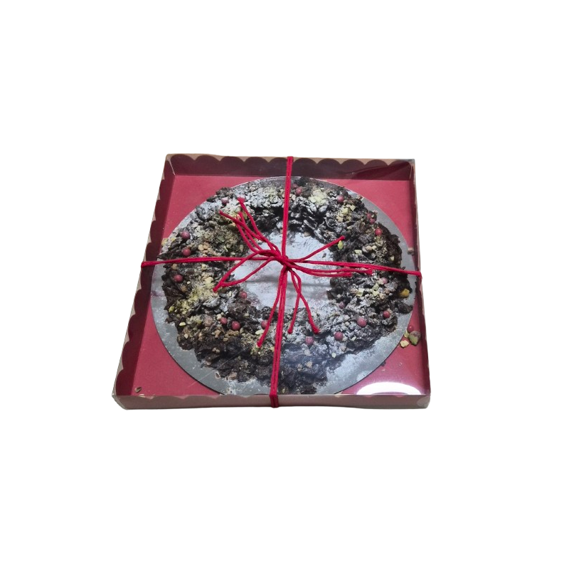 Ingredientes: CHOCOLATE NEGRO chocovic tobado (31,82 %) (leche y soja ), Corn Flackes (31,82 %), Arándanos frescos (18,18 % ), ALMENDRA MARCONA ( 9,09 %) , PISTACHO TOSTADO (9,09%)